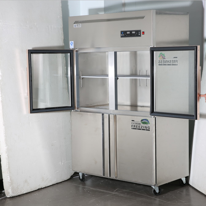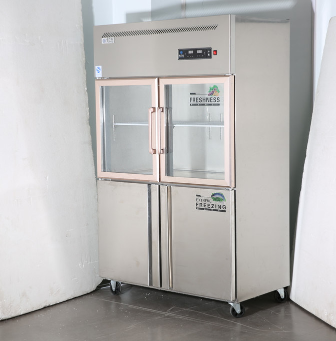 La température de la porte d'acier inoxydable utilisée dans la moitié inférieure est entre 0~-18℃. Elle permet à des invités de mettre certaine rarement employée et à la température plus basse de la gaffe dans la partie plus inférieure du congélateur.